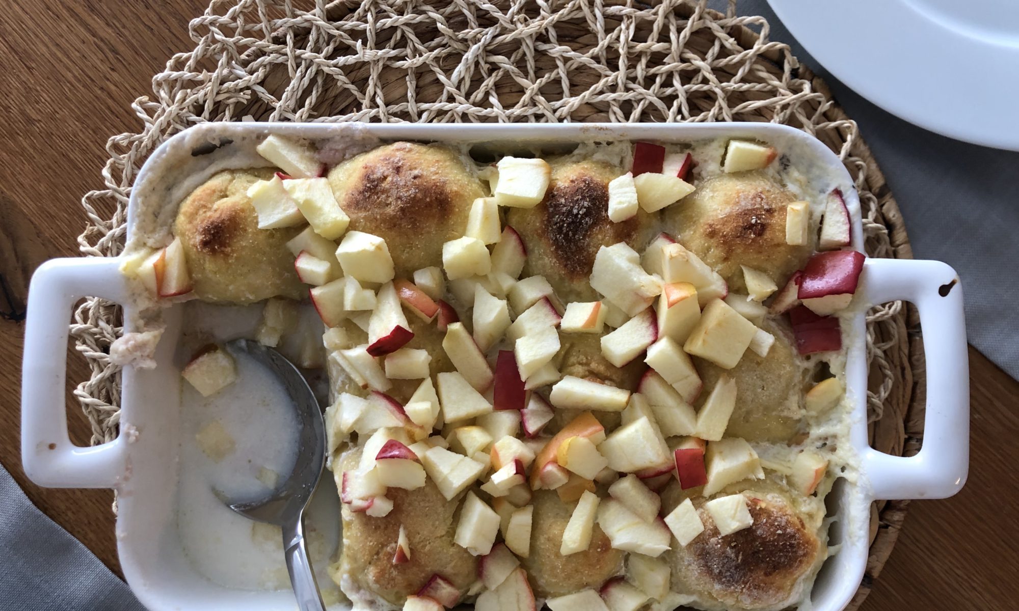 Aus dem Teig eine Rolle formen und diese in zirka 12-20 Stücke schneiden. Je nach Größe der Zwetschken – bei mir wurden es nur 12 Knödel – riesige Zwetschken und außerdem nicht mehr Platz in der Form. Die Zwetschke mit Teig ummanteln und zu Knödeln formen. Eine ofenfeste Form mit Butter bestreichen und die Knödel hinein schlichten. Bei 200° Unter- und Oberhitze etwa 45 Minuten backen (bis sie leicht braun werden). Dann die Milch-Zucker-Mischung übergießen und Apfelstücke darüber streuen und weitere 15 Minuten backen. Am besten frisch mit Staubzucker bestreut servieren und genießen.